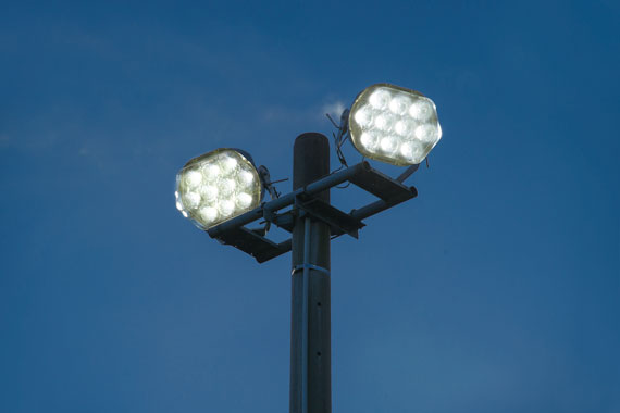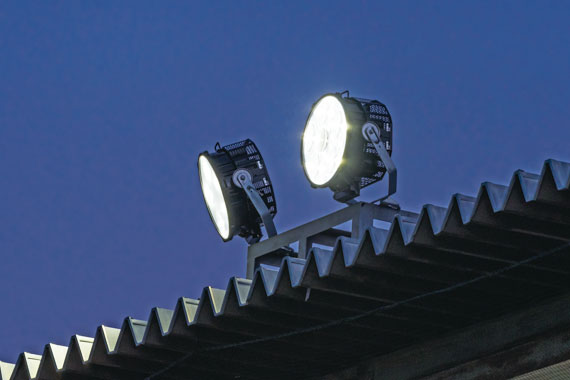 既設のHIDランプ1000W投光器に替えて、高出力形LED投光器「レディオック フラッド デュエル560W」及び「レディオック フラッド ブリッツ190W」を設置し、台数削減と出力の小型化により、電気消費量の大幅削減を実現。最遠部のネットを照らす照明はスタンド上からとネット手前の照明の両方で行っているため、ネット手前の器具はHIDランプ1000WからLED 200Wタイプと照度をあえて落とし、スタンド上にレディオック フラッド デュエル560Wを設置しました。最遠部まで光が届く高出力形LED投光器を設置することで空間照度の均斉化を図り、鉛直面、垂直面照度ともに向上させ、打球の落下点が確認しやすい良好なナイター照明環境をつくり出しています。