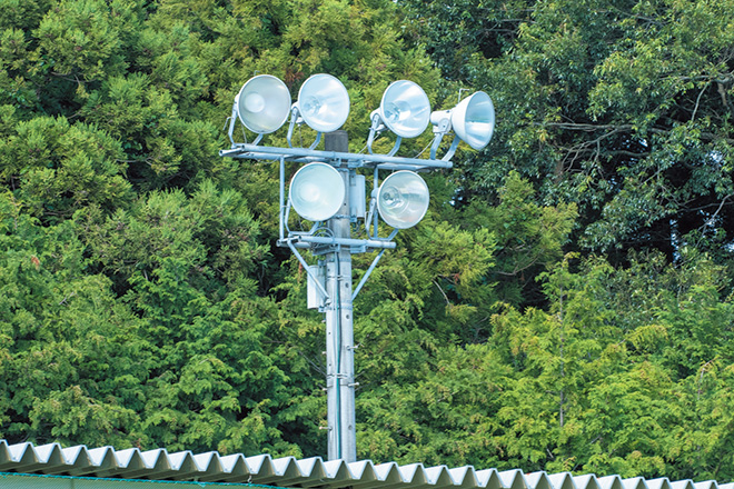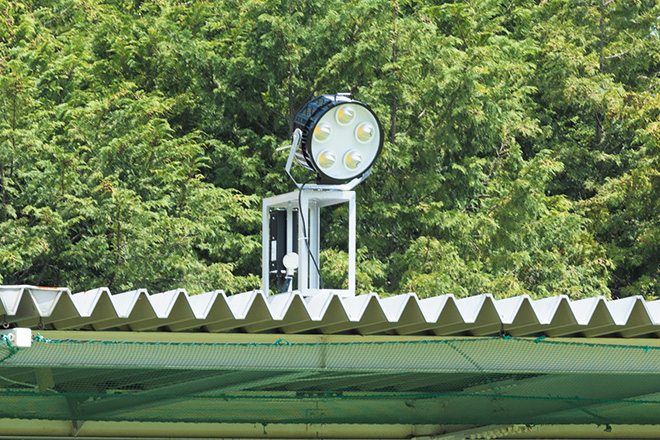 おゆみ野ゴルフガーデンでは、2018年7月に照明設備のリニューアルを実施し、フェアウェイ照明をLED化するとともに、クラブハウスの照明もLED化し、省エネと明るさの向上を両立させました。フェアウェイ照明については、『ゴルフボールをより見やすく』をテーマにした照明設計とし、既設コンクリート柱に取り付けていたメタルハライドランプに替えて、新規に制作した屋根上架台に高出力形LED投光器「レディオック フラッド デュエル」を設置して、台数を減らしつつ照度アップを実現しました。LED投光器の採用にあたっては、あらかじめデモ器を屋根上に仮置きして照度などの検証を行い、明るさを確認したうえで決定しました。