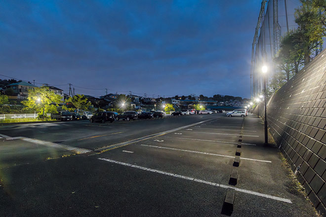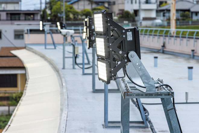 横浜スパークゴルフクラブでは、2022年3月に照明設備のリニューアルを行い、フェアウェイ、パター・バンカー練習場、クラブハウス、駐車場などの照明をLED化し、省エネと明るさの向上を実現しました。フェアウェイ照明については、既設メタルハライドランプに替えて、メタルハライドランプ1000W相当の明るさを確保するLED投光器「レディオック フラッド アヴァン 400クラス」を屋根上に設置して十分な空間照度を確保し、220ヤード先のネット際までしっかりと光が届く良好な照明環境をつくり出しています。パッティンググリーンの照明には軽量・コンパクトなLED投光器「レディオック フラッド ネオ 80クラス」をご採用いただき、天然ベント芝のグリーンを鮮やかに照らしています。