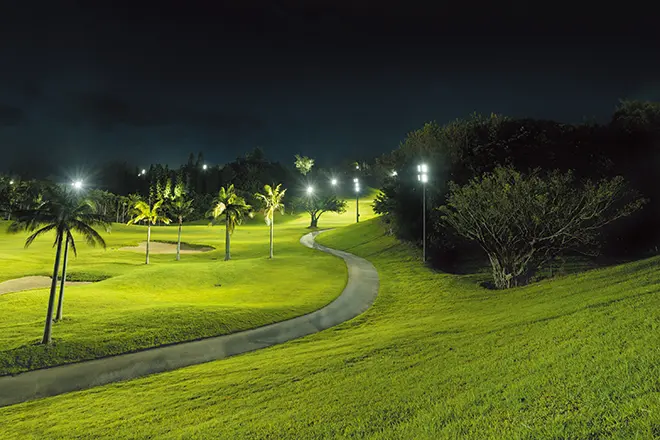 チャンピオンコース18ホールでナイタープレーを楽しめるゴルフコースを快適に照らすLED投光器