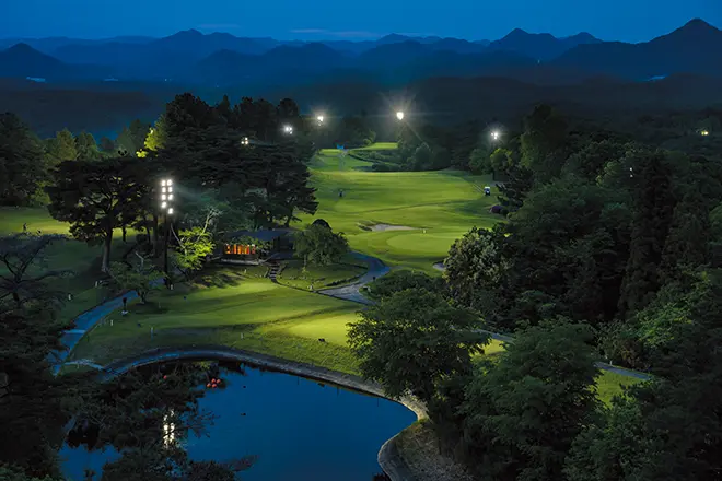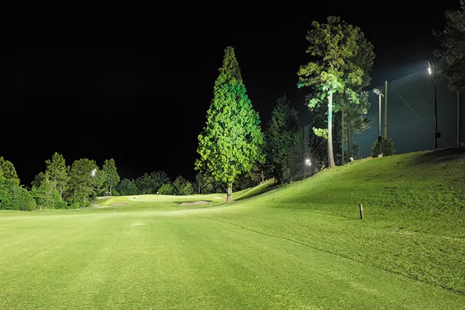 2024年より設置した夜間照明には最新LED照明を導入し、ティーイングエリア150ℓx以上、フェアウェイ50ℓx以上、グリーン150ℓx以上と設計照度を高く設定しておりますので、国内でもトップクラスの明るさとなりました。今までより鮮明に飛球やグリーンのアンジュレーション(起伏)が分かるため、快適にプレーが楽しめます。