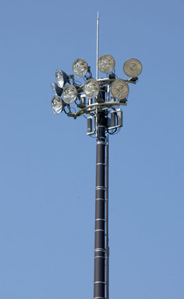 - 夜間も安全かつ快適にプレーが楽しめるようナイター照明を完備、最下段24mのコンクリート柱に設置されている投光器は光漏れを抑制する内蔵ルーバ付で、周辺への環境にも十分配慮した照明計画となっています。また、高効率投光器 アクロスターを採用し、省エネルギーにも貢献しています。照度レベルは、各競技ともレクリエーションレベルを確保しています。