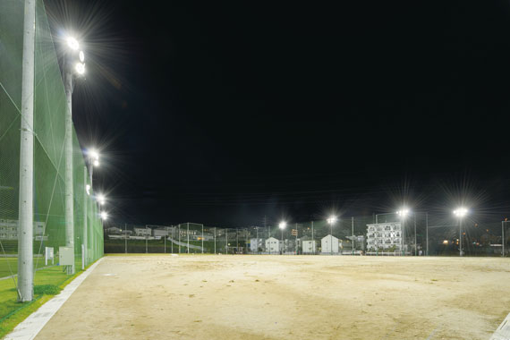 広大なキャンパス内に新設された多目的グラウンドを高効率形LED投光器で照らし、省エネと良好なナイター照明環境を両立