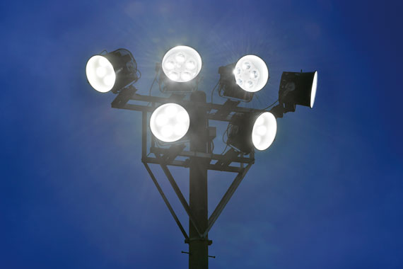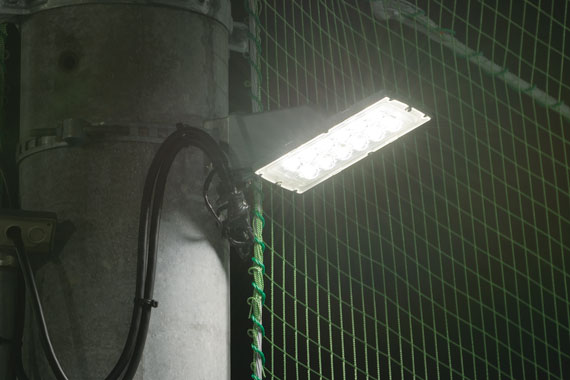 照明設備としては、明るさを一般競技レベル(平均維持照度300ℓx程度)と設定し、環境問題と省エネルギーを考慮して照明のLED化を図り、高出力形LED投光器「レディオック フラッド デュエル」を設置、消費電力削減と長寿命(40000時間)による省メンテナンスにも繋がる夜間照明設備を新設しました。