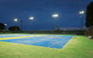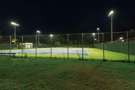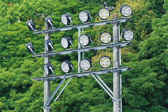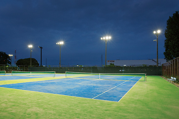 2017年6月には、省エネ推進及び省メンテナンスなどの観点から各施設のナイター照明をLED化する工事を実施しました。野球場、テニスコートについては既設照明の配置が適切であったため、灯具交換にてLED化を行うこととし、軟式野球やソフトボールに使用されている野球場は、既設メタルハライドランプ1000Wに替えて同数の高出力形LED投光器「レディオック フラッド デュエル560Wタイプ」を設置。メタルハライドランプ1000W相当の明るさを持つ「レディオック フラッド デュエル560Wタイプ」に置き換えることで、124%の照度アップと約53%の電力量・CO₂排出量削減を実現しました。人工芝3面を備えたテニスコートには、メタルハライドランプ700W相当の明るさを持つ「レディオック フラッド デュエル310Wタイプ」を特注架台2灯用と4灯用に設置し、平均照度200ℓxを確保しています。