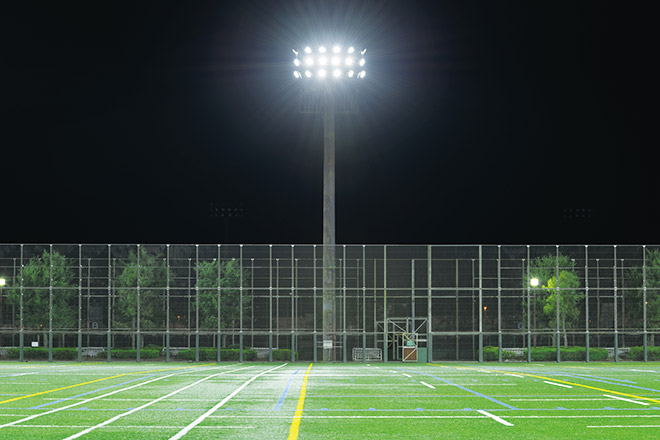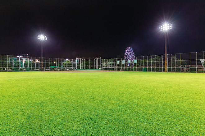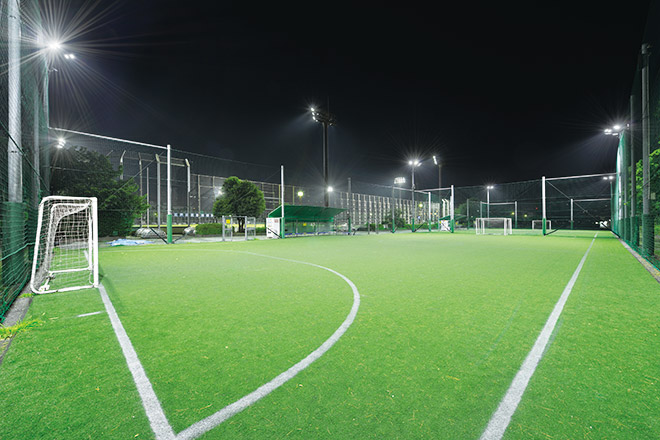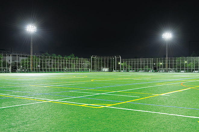 さまざまなスポーツを楽しむことが出来る球技場のナイター照明をLED化し、周辺環境への漏れ光にも配慮した良好な照明環境を創出