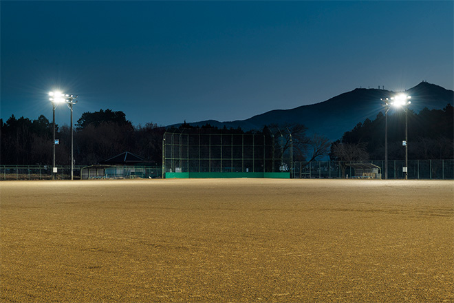 照度についても、メタルハライドランプ1kW相当の明るさを持つ500クラスを設置したことにより、既設平均131ℓxが250ℓx(内野407ℓx、外野237ℓx)に改善され、野球、ソフトボールやサッカーなど、スポーツ・レクリエーションの場として市民の皆さまに広く親しまれている施設を、明るく快適なナイター照明で照らしています。