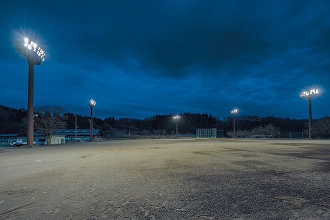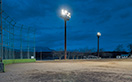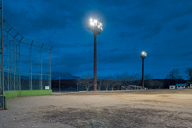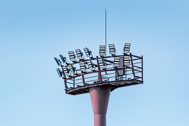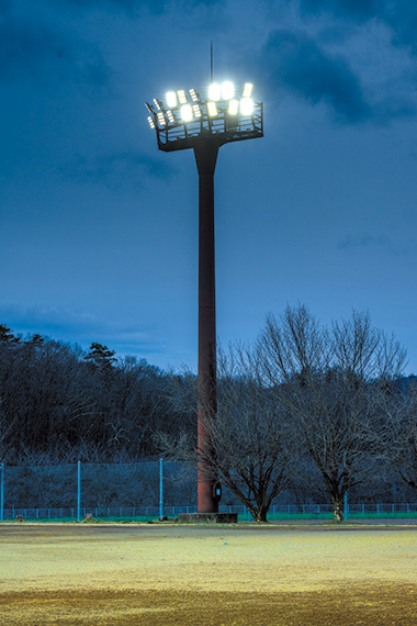 飯綱町では、CO₂削減、省エネ推進などの観点から、独立行政法人日本スポーツ振興センターのスポーツ振興くじの助成を受け、夜間照明を全面LED照明に改修することとし、2期にわたる工事でLED化を実施しました。照明鉄塔6基のうち2基を2022年にLEDに更新し、2024年3月に残り4基のLED化を行いました。夜間も運動場を明るく快適に照らす光には、既設メタルハライドランプに替えて、高効率形のLED投光器「レディオック フラッド アヴァン 700クラス」を選定し、メタルハライドランプ1500W相当の明るさで省エネを実現しつつ、良好な照明環境を実現しています。既設取付架台に設置したLED投光器は、まぶしさを抑えるため、クロスエイミング方式を用いてグレアの低減を図りました。