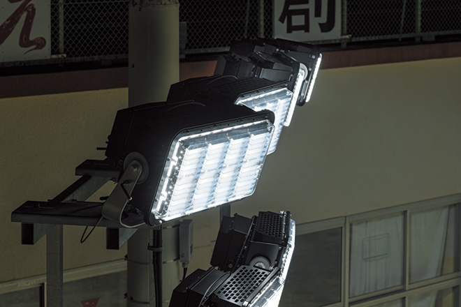 足立区では、2024年10月にグラウンドの照明設備をLED化する改修工事を実施しました。LED化にあたっては、小学校が住宅地に隣接していることから、周辺への漏れ光に十分配慮のうえ、全配光で環境省策定の「光害対策ガイドライン(令和3年3月改訂版)」光環境類型E1に準拠するLED投光器「レディオック フラッド アヴァン 光害対策形 400クラス」を採用しました。光害の原因となる上空や周囲への漏れ光をカットしつつ、グラウンドを明るく均一に照らし、快適な照明環境を創出しています。既設メタルハライドランプ1000W×30台と同じ台数で既設と同等以上の照度を確保し、省エネに貢献するとともに、中角タイプ、狭角タイプの2種類の配光を組合せてグレアの抑制にも注力しました。