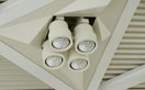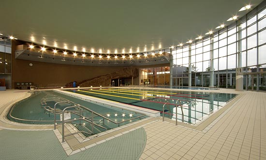 - 施設形状が円形のため照明器具の配置は、周囲の壁面上部の全周配置です。ランプ交換における維持管理対策として、高所取付ですが、足場などの設置が不要で背面作業が行える方法として、建築にて器具取付部を回転出来る構造を採用しました。温泉施設を併設している屋内温水プールであるため、器具は前面ガラスのテフロン膜付、安定器は周囲温度-10℃~50℃仕様とし、ランプは高演色・高効率・長寿命の特性を持つ、セラミックメタルハライドランプ400Wを採用しました。照度レベルはレクリエーションレベルとし、昼間時は太陽光の入射の補光照明として、壁側の灯具を点灯しています。