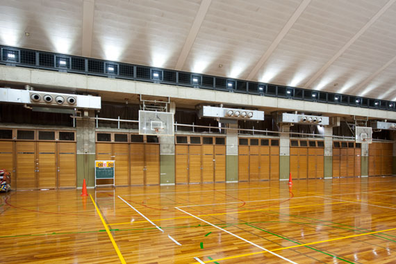 Myリストに追加四天王寺学園高等学校・中学校は、1922年(大正11年)に聖徳太子1300年御忌記念事業として創設された伝統のある私立女子校です。バレーボールの強豪校でもある同校の練習場などに使用されている体育館の照明設備改修が実施され、LED照明が採用されました。設計照度はバレーボールの一般競技レベル程度(改修前のHID投光器による照明設備と同程度)とし、十分な照度を確保しています。省エネルギー化、CO₂排出量削減に貢献するLEDを光源とする投光器は、瞬時再点灯が可能なため、こまめに点灯・消灯をして省エネが図れる点にも着目いただき採用されました。配置、エイミングは改修前の既設投光器に倣い、天井中央は角度をつけて振り分け、天井サイドにはアッパーにすることで、バレーボール競技に必要な空間照度を確保しています。配光タイプの選考については、現地で実際に点灯実験を行い、グレアを低減できる配光を選択しました。今回のLED照明化により、改修前と比較して約60%以上の消費電力削減につながり、大幅な省エネを実現することができました。