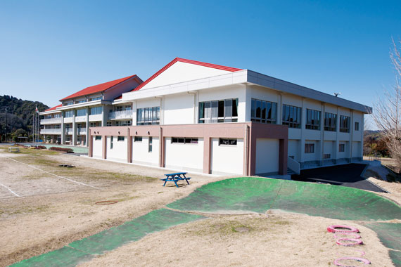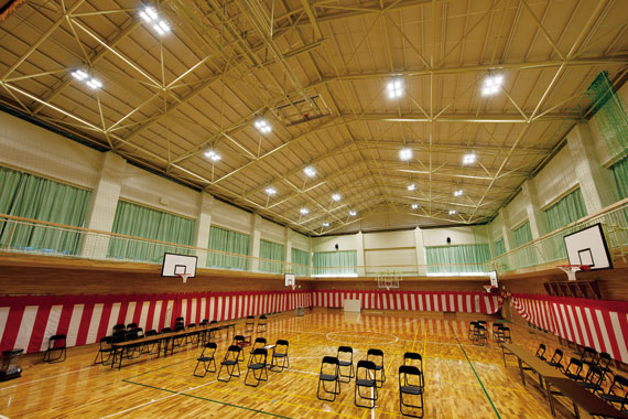 大多喜町では公立の義務教育諸学校など施設の整備計画に基づき、1973年に建造された町立西畑小学校屋内運動場の耐震判定を行った結果、Is値※が基準を下回っていることが判明し、新規、建て替えを実施しました。建て替えに伴い、千葉県内の小学校では初となるLED照明が導入されました。アリーナ照明にはLED高天井用照明器具を採用し、グレア対策のプリズムカバー加工を施したレディオック シーリングHBを2台1組で40台設置。初期光束補正ユニットを設置して60000時間の長寿命と大幅な省エネを実現しました。また、舞台にはセルフバラスト水銀ランプ500Wと同等以上の明るさを確保するLED投光器(レディオック フラッド ネオ)を設置しています。