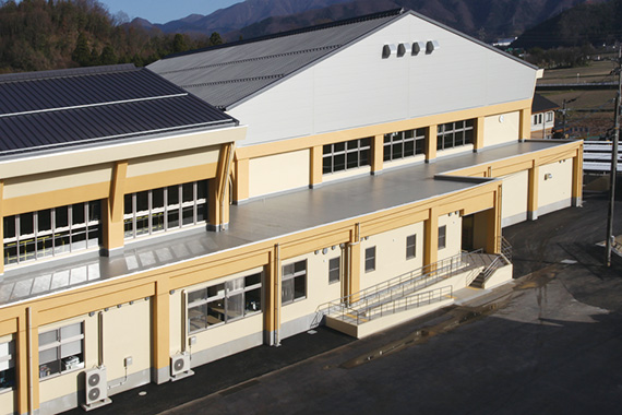 米原市では、旧双葉体育館とプールを取り壊し、2013年3月、跡地に新たに双葉総合体育館を竣工しました。中学校体育館としての機能と、市民の皆さまの健康づくり、生涯スポーツにご利用いただける社会体育施設としての機能を併せ持つ地域密着型の新体育館として建設されたもので、鉄筋コンクリート造平屋建て、延べ床面積は2,560m²。バスケットボールコートが2面とれる大アリーナとバレーボールコートが1面とれる小アリーナ、レクリエーションルーム、ミーティングルームなど充実した施設を備えています。大アリーナと小アリーナの照明設備については、高効率で長寿命のFECセラルクスエースPROを採用し、大幅な省エネと高演色性を実現しました。併置形安定器と電動昇降装置の組合せでメンテナンスにも配慮しています。さらに、保安照明として、始動性の高いLED高天井用照明器具「レディオック ハイベイ ラムダ」を採用し、安全で快適な視環境の創出を図りました。