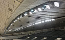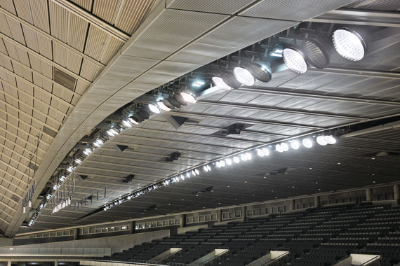 昨年度、老朽化した施設の一斉改修工事としてメインアリーナの照明改修工事が行われ、2013年4月にリニューアルオープンされました。主照明としては、既存照明より効率のよい1kWメタルハライドランプ用投光器に改修を行い、保安照明は既設の1.5kWハロゲンランプ用投光器から、LED 190W照明投光器に改修しました。さらに、観客照明として、新たにLED 35W投光器を設置。LED照明を使用することで省エネを推進すると同時に、停電時の瞬時点灯を可能にしています。1kWメタルハライドランプ用投光器は、設置場所に応じて縦ルーバ、横ルーバを使用し、プレーヤーのグレア対策についても配慮しています。また、メンテナンス性の向上として、照明器具が180度回転するように照明器具アーム部分の形状を変更して、定期点検・定期清掃などを容易に行えるようにしました。