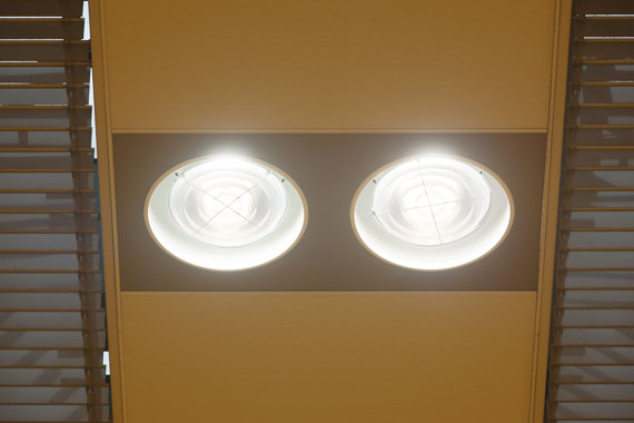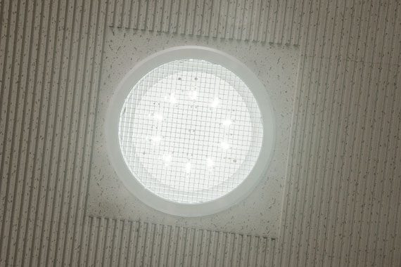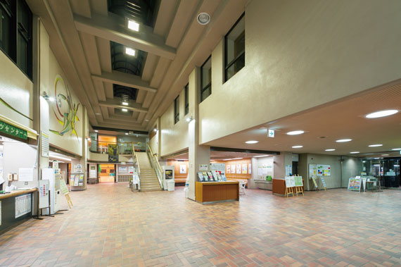 横浜市緑区にある横浜市緑スポーツセンターでは、既設照明の老朽化に伴い、照明器具の改修工事を実施しました。第1、第2、第3体育室、トレーニング室、廊下など、それぞれの場所に合わせて、特注HID照明やLED照明を設置。バレーボール、バスケットボール2面分の広さを持つ第1体育室は、メタルハライドランプと高圧ナトリウムランプの混光だった既設照明に替えて、セラミックメタルハライドランプ660W(FECセラルクスエースPRO2)を設置し、高効率と高演色性を両立する光で消費電力の削減を実現しました。エントランス付近には、既設サークライン(円形蛍光灯)と同じ形状にすることにより工期を短縮した特注LEDダウンライトを配し、明るさと安全性を向上しています。体育室やエントランスの灯具は全て現場のサイズに合わせて作りました。また、屋内の吹き抜け部分や屋外ブラケットにLED投光器(レディオック フラッド ネオ)を採用、屋外のポールライトもLEDを光源とするなど、省エネに貢献する光で、安全で快適な照明環境を創出しました。