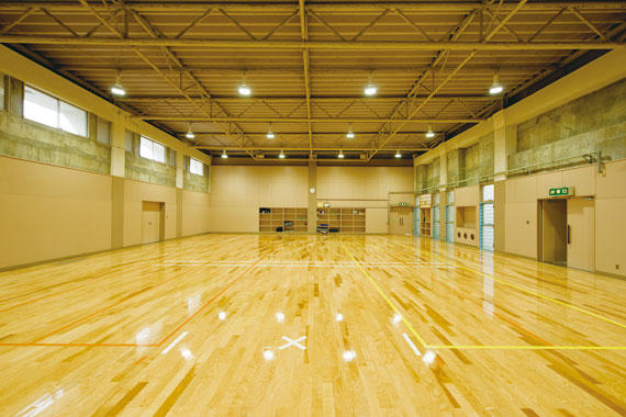 福岡県大川市の大川市民体育館では、施設の老朽化による体育室などの改修工事を実施し、2013年3月にリニューアルオープンしました。大・小体育室の床・壁の張替を行い、大体育室にバスケットゴールを設置。また、今回の改修工事に伴い、照明をLEDに更新しました。バレーボール3面分の広さを持つ第一体育室は、既設のメタルハライドランプ700W及び高圧ナトリウムランプ700Wに替えて、高効率・高出力のLED高天井用照明器具レディオック ハイベイ ラムダ 200Wタイプを設置、小体育室も既設のメタルハライドランプ400Wに替えて同様にレディオック ハイベイ ラムダに更新し、大幅な省エネを実現しました。