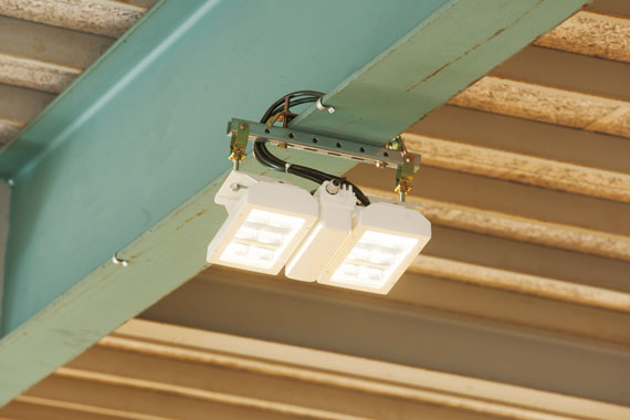 既設水銀ランプ400Wに替えて新たに設置したLED照明には、大幅な省エネに貢献するLED高天井用照明器具「レディオック ハイベイ ラムダ200W」及びLED高天井用照明器具「レディオック シーリングHB」を採用し、平均照度500ルクスを確保しました。光色は白色(5000K)をベースに電球色(3000K)を混ぜ、演色性を向上させるとともに、列ごとの調光、消灯を可能とし、用途に応じてより効果的な照明環境をつくることができました。アリーナでの部活動はもちろん、イベントの舞台照明やプロジェクター使用時にも効果を発揮しています。また、LED照明はこまめな点灯消灯が可能ですので、さらなる節電が図れることと期待しています。