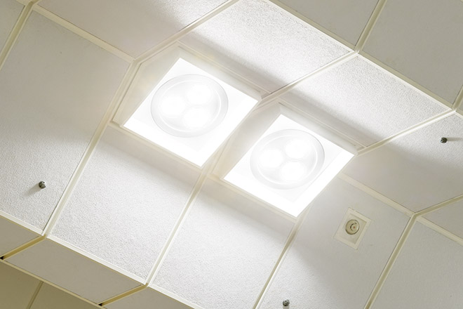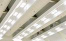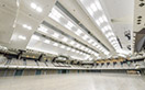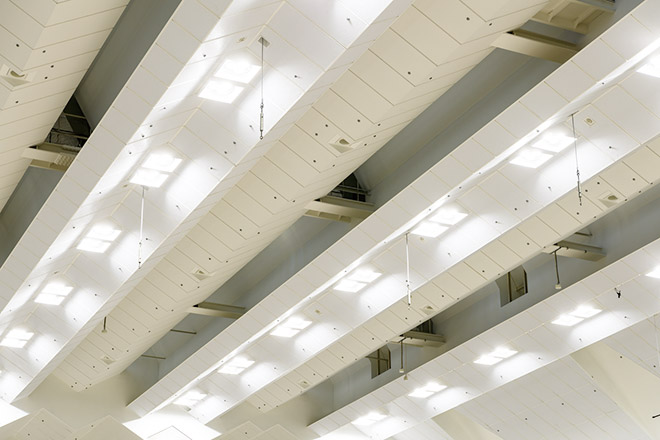 既設の照明設備はメタルハライドランプ1000Wと高圧ナトリウムランプ660Wの混光照明でしたが、同数のLED高天井用照明器具「レディオック ハイベイ アルファ 320Wタイプ」に更新することで、既設と同等の維持平均照度1500ℓx以上の照度を確保しながら、大幅な消費電力の削減を実現しました。演色性についても平均演色評価数Ra80以上と向上し、より自然な色を再現する快適な照明環境としています。また、LED照明器具には、利用者がまぶしさを感じないよう配慮のうえ、拡散パネルを取り付けてグレア対策を講じました。各種競技の練習や大会に加え、企業や学校の運動会など多様な用途で年間を通じて使用頻度の高い大武道場を、省エネに貢献し、光束維持時間60000時間と長寿命で省メンテナンスに貢献するLEDの光で照らし、明るく良好な光環境を創出しています。