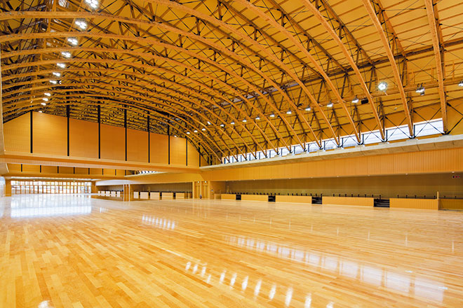 Myリストに追加昭和電工武道スポーツセンター(大分県立武道スポーツセンター)は、大分県の県営運動公園である大分スポーツ公園内に、2019年4月に完成した武道スポーツセンターです。大規模大会も開催可能な武道をはじめとする屋内スポーツの拠点とすること、県民の誰もが気軽に利用できる施設とすること、トップリーグ公式戦や各国代表の合宿開催によるスポーツ観光の拠点とすること、大規模災害に備えた広域防災拠点の中核施設とすることを基本理念として建設されました。RC造3階建て一部S・W造で、建築面積14,551.68m²、延床面積16,125.56m²という規模を誇り、武道競技が8面取れる約3,570m²の広さを持つ多目的競技場と、武道専門の道場が3面ある競技面積約2,410m²の武道場に加え、トレーニングルーム、会議室など充実した施設を備えています。施設の天井は木造のアーチトラス構造を採用し、構造用製材として県産スギを活用した無垢材としては日本最大級の大スパン(約70m)の屋根架構化を図ることで暖かみのある大空間を実現しました。また、エントランスや照明カバー、壁面などの内装に竹工芸品を使用するなど、大分らしさにあふれた施設づくりを目指しました。