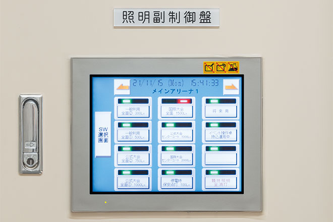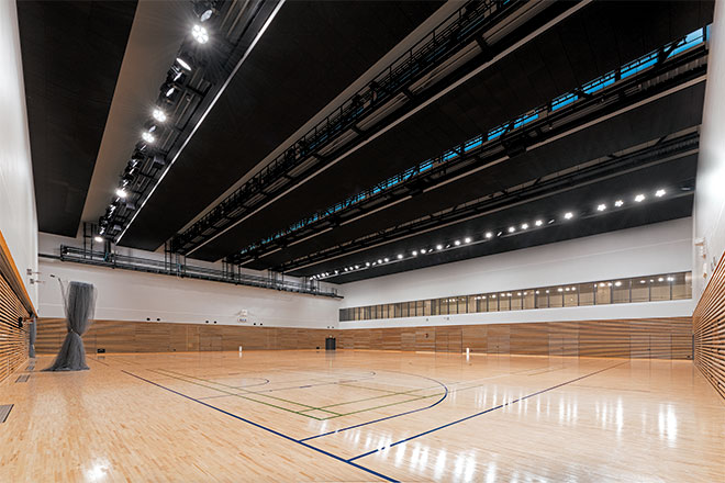 メインアリーナ及びサブアリーナの照明計画については、設計段階から各競技団体などと協議を行い、実施設計時に照度やグレア(まぶしさ)について十分検討のうえ、設置位置を決定しました。特に光源を見上げた時のまぶしさを軽減するため、競技者の視線方向に高輝度照明がない機器配置としています。照明器具には、メインアリーナ、サブアリーナともに国際レベルのスポーツができる照度基準を求め、国際大会でのTV放送規格やスポーツ連盟の推奨基準を満たす平均演色評価数Ra90、色温度5600Kの高出力形LED投光器「レディオック フラッド デュエル」を選定しました。アリーナをむらなく照らしながらもグレアを抑え、質の高い照明環境を創出しています。また、メンテナンス性に配慮し、各照明設備には上下前後に移動できる取付架台と専用金具を設置しています。専用架台については事前にモックアップを作成し、作業の安全などの検証を十分に行いました。