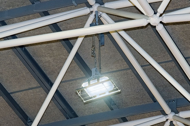 今回の照明改修では、さまざまなクラブの練習や講義など多目的に使用されている体育館を安全・快適に照らし出すよう設計を行い、超広角タイプの照明器具に前面ガードを装備することでグレア対策にも十分配慮し、明るくかつ均斉度の高い照明環境とすることができました。