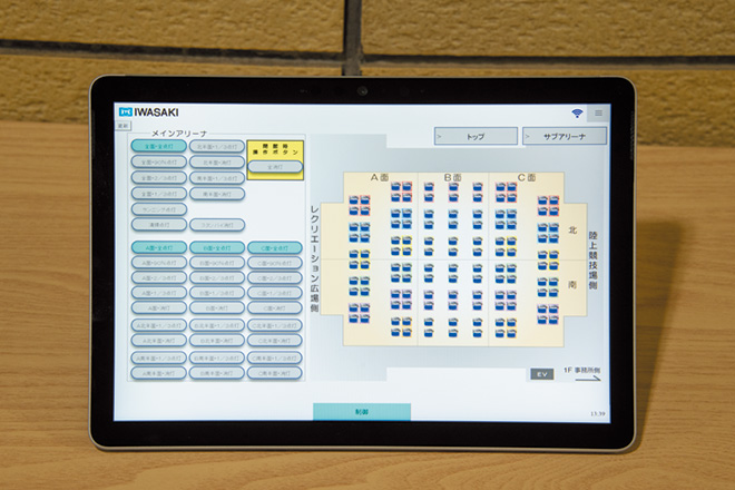 2022年3月にリース事業として、総合体育館メイン・サブアリーナ及び周辺街路灯などをLED化しました。2,390m²の広さを持つメインアリーナには、LED高天井用照明器具「レディオック ハイベイ ガンマ 無線調光形」180W・235W・280Wを、1,060m²の広さを持つサブアリーナには「レディオック ハイベイ ガンマ 無線調光形 235W」をご採用いただき、省エネに貢献しつつ明るく高品位な照明環境を創出しました。両アリーナは、バスケットボール、バレーボール、ハンドボール、バドミントンなど多様な用途で使用されていて、メインアリーナはバスケットボールのWリーグ、バレーボールのVリーグにおいて、大会会場としても利用されています。また、各種競技や使用目的に応じて適切な照度や点灯パターンを制御できるよう、無線制御システム「Wi-CONNECTY(ワイ コネクティ)」をご採用いただきました。事務室からタブレット操作により、メインアリーナとサブアリーナの照明制御が可能で、100%・90%・60%・30%点灯の4パターンを設定しています。また、個別調光や1%単位での任意調光も可能です。
