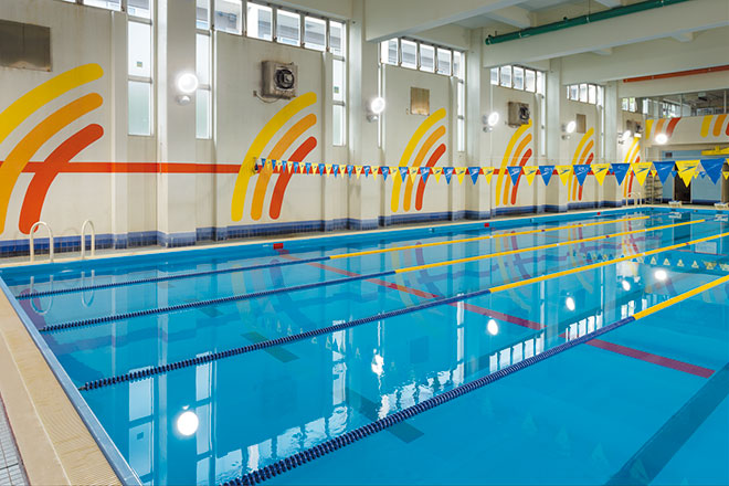学校附属の「ウエルネススポーツセンター」では、25m×5コースの室内温水プールを保有しており、スポーツトレーナーやインストラクターなどの指導者育成を目指し、必要な専門知識や指導技術を身につける教育を行っています。また、地域貢献の観点から、乳幼児から高齢の方まで幅広い年代の方々を対象としたスイミングスクールを運営しています。