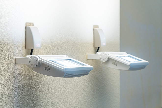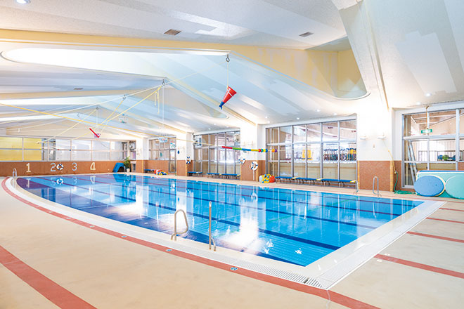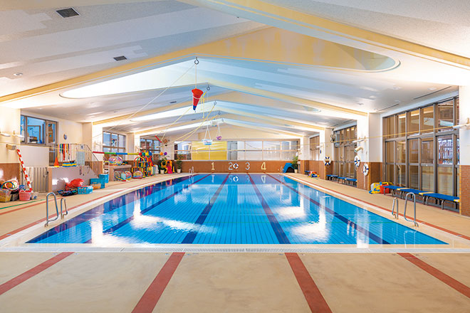 省エネ、省メンテナンスに貢献するLEDの光で屋内プールをやさしく照らし、安全で快適な照明環境をつくり出しています。