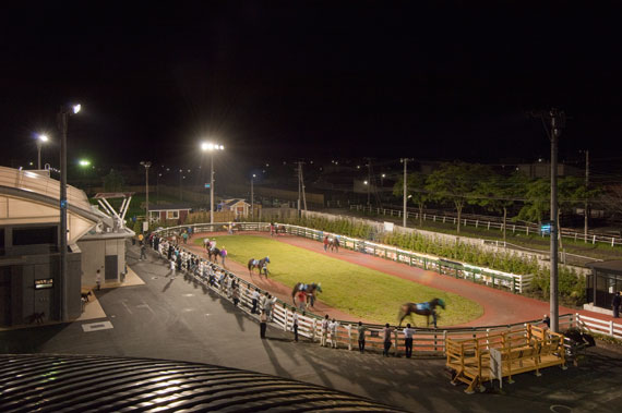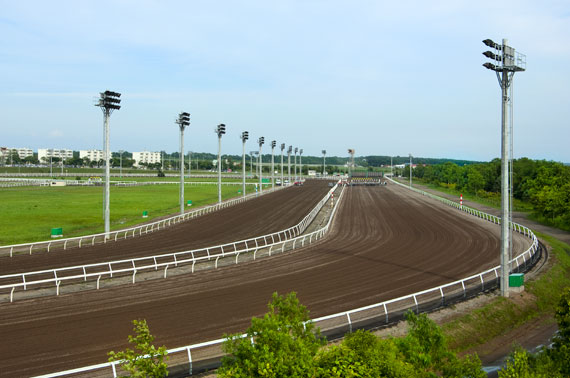 門別競馬場は、北海道沙流郡日高町に位置し、1997年12月に開設された日本で最も新しい競馬場です。従来よりトレーニングセンターとして使用されていたコースを改修してホッカイドウ競馬のひとつの開催場所としましたが、2009年より開催のほとんどを本競馬場に集約することとなり、また、その全日程をナイターレースで行うことが決定され、スタンドの増設ならびに周辺設備整備に並行して照明設備が新設されました。副題の「グランシャリオナイター」(グランシャリオ=北斗七星)は一般公募により決定された夜間開催レースの愛称です。本競馬場は、地方競馬専用競馬場としては、国内最大級の規模で右回りダートコース1周1,600mを擁し、ゴール前は330mの長い直線となっています。また、コース幅も広くフルゲート16頭に対応しているのは、本場と大井競馬場だけです。