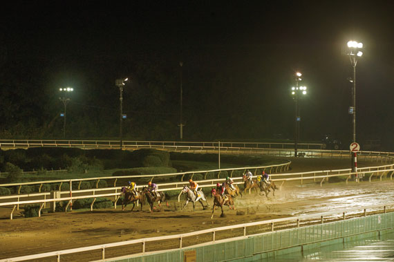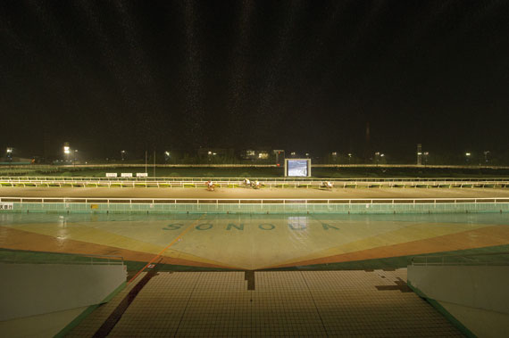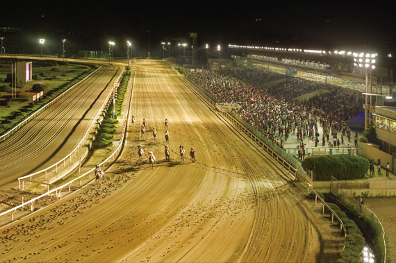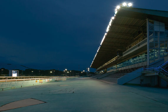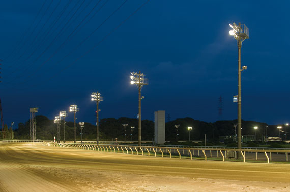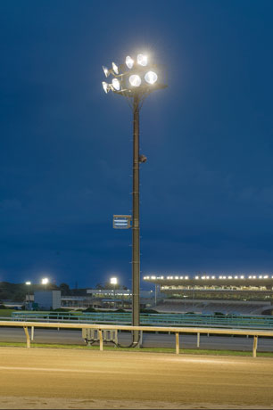 「そのだ金曜ナイター」という愛称のもと、9月7日から11月9日までの毎週金曜日に開催。2013年も4月から11月上旬までの金曜日にナイター競馬を開催する計画です。ナイター照明には、効率改善形投光器 アクロスター(アイ マルチメタルランプ1500W)と一部LED投光器(レディオック フラッド ブリッツ460Wタイプ)を採用し、走路に15mの照明柱39基を新設。スタンドと事務所の屋根上にも同投光器を設置しました。地方競馬のナイター開催は、東京・大井競馬場や高知競馬場などに次いで全国6か所目となりますが、園田競馬場のナイター照明はとても明るいと高評価をいただいています。