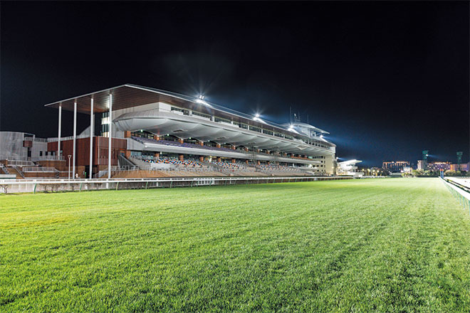 日本中央競馬会では、2022年5月に、調教用コース照明として使用されていたHID投光器をLEDに更新する工事を実施しました。早朝、ダートコース及びウッドチップコースで競走馬の調教をする際に使われる照明として、高効率・高演色形LED投光器「レディオック フラッド ゼスト」をご採用いただき、コース外周の照明柱とスタンド屋上からコースを照らし出しています。
