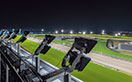 日本中央競馬会では、2023年11月に馬場照明増設工事を実施しました。冬期間における最終競走発走時の馬場の照度を確保することを主目的としたもので、照明が増設されたことにより、遅い発走時刻のレースが可能となりました。パトロールタワー、コンクリート柱及びスタンド屋上に新たに設置された照明器具には高効率・グレア抑制形LED投光器「レディオック フラッド ゼスト 1100クラス」をご採用いただき、まぶしさを抑制した高次元の照明環境を実現しています。レース時点灯とダートコース調教時点灯時で照明設計を作成のうえ、芝コース、ダートコース共に馬場の基準値110ℓx以上を満たし、ゴール前においても独自の鉛直面照度の基準を満たすよう設計しました。日没時間が早まる冬期の最終レースも、広角・中角・狭角配光を組合せた均斉度の高い光で馬場を照らし出し、エキサイティングなレース展開を楽しんでいただける十分な照度を確保しています。