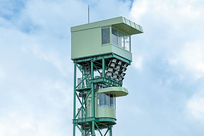 パトロールタワー、コンクリート柱及びスタンド屋上に新たに設置された照明器具には、高効率でありながらまぶしさを抑制したLED投光器「レディオック フラッド ゼスト 1100・500クラス」をご採用いただきました。芝コース・ダートコースともに設計上の基準である水平面平均維持照度110ℓx以上を満たし、ゴール前後においても鉛直面照度の基準値を満たすように設計されています。広角・中角・狭角配光を組合せた均斉度の高い光で馬場を照らし出し、最終レースでもダイナミックなレース展開を楽しんでいただける十分な照度を確保しました。