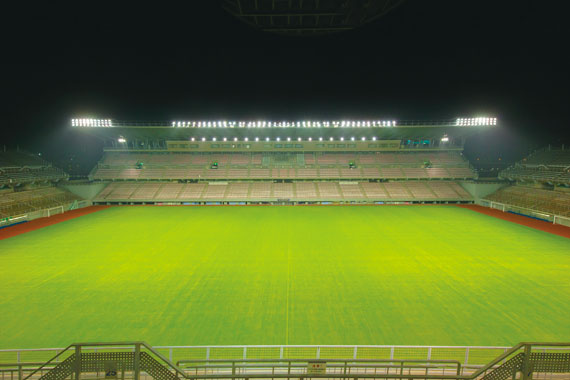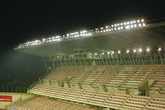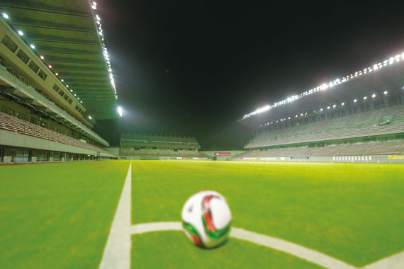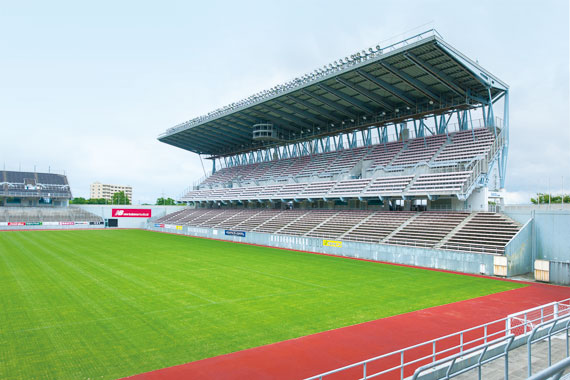 完成から15年以上経過したスタジアムでは、設備の老朽化が見られるとともに、Jリーグが新たに導入したクラブライセンス基準への対応などを踏まえ、2013年度から2~3年をかけて施設の一部改修を順次行っています。その一環として、2015年のJリーグホーム開幕戦を前にフィールド芝生の全面張り替え工事を行い、同時に夜間照明設備の改修工事も実施されました。Jリーグ規約において、J3を除く公式試合を開催するスタジアムには、フィールドのいずれの箇所も1500ℓx以上の照度確保が求められています。そのため、今回の改修では施設運用方法も踏まえ、既設HIDランプ1800W×342台に替えて、同数のHID投光器アクロスター(アイ マルチメタルランプ1500W)を設置。省エネに配慮しつつ、Jリーグ開催基準である1500ℓx以上の照度を確保しました。臨場感あふれるスポーツ観戦が楽しめるスタジアムのフィールド全体を均一な照明で照らし出し、良好なナイター照明環境をつくり出しています。