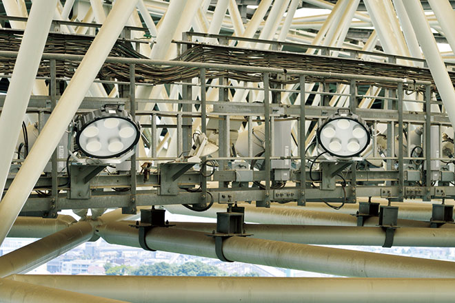 埼玉スタジアム2002では、新設時から約18年が経過し順次設備の更新を進めており、2018年3月には観客席を照らす照明設備をLED化する工事を実施し、既設HID投光器に替えて高出力形LED投光器「レディオック フラッド デュエル」を設置しました。台数はそのままで既設の架台を流用のうえ、配線工事を行ってLED投光器に更新することで、これまでと同等以上の照度を確保しつつ消費電力は半分以下となり、大幅な省エネに貢献しています。工事にあたってはキャットウォークを使用する高所での作業であったため、安全管理に万全を期すとともに、照明器具には落下防止ワイヤを取り付け、より安全性の高い施工に留意しました。