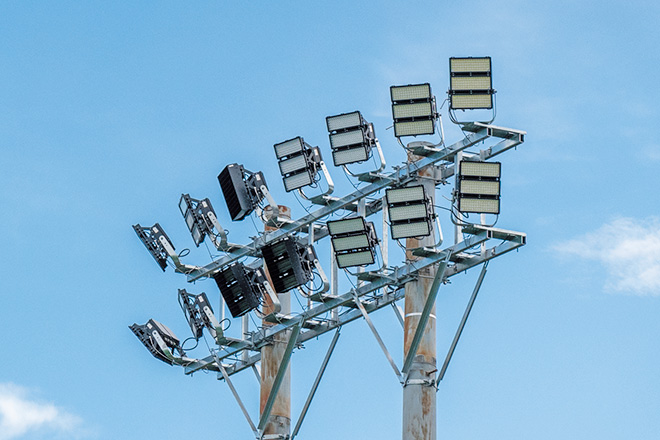 関東大学リーグの強豪である蹴球部は、Jリーグや世界のクラブで活躍する選手を数多く輩出している歴史ある名門サッカー部です。その主練習場である第一サッカー場の改修工事が2023年3月に実施されました。人工芝の全面張り替えに加えて照明の改修も行われ、既設HIDランプ1000Wに替えて、LED投光器「レディオック フラッド アヴァン 400クラス」をご採用いただきました。消費電力427W(最大時)でメタルハライドランプ1000W相当の明るさを確保して省エネを推進するとともに、既設照度170ℓxから200ℓxへと照度アップも実現しています。既設ランプが寿命時期に入り、交換頻度が高くなっていたこともあり、光束維持時間40000時間の長寿命で省メンテナンス化も図りました。既設鉄塔を使用して架台と照明を入れ替え、各鉄塔に付いている分電盤4面の改修とキュービクルにMC盤(電磁開閉器)の新設取付も行っています。