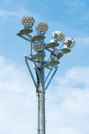 長浜公園は、横浜市金沢区にある横浜市立の都市公園(運動公園)です。横浜横須賀道路を挟んで北側と南側に分かれ、北側には野球場、テニスコート、多目的運動広場(サッカー場)などの運動施設があり、噴水のある中央広場には、芝生広場や健康遊具が配置されています。また、南側には野鳥観察公園があり、自然と共生した緑豊かな環境が広がっています。横浜市環境創造局公園緑地整備課では、2013年3月、テニスコートのナイター照明施設改良工事を実施し、テニスコート用ナイター照明としては横浜市初となるLED照明を採用しました。全部で6面あるテニスコートを照らす既設の照明柱8基は、これまでのメタルハライドランプ1kWに替えて高出力形LED投光器(レディオック フラッド ブリッツ460W)に更新し、新たに同LED投光器6灯用照明柱4基を設置。レクリエーションレベルの照度を確保し、均斉度の高い良好な照明環境を創出しています。
