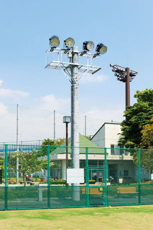 新杉田公園は、横浜市磯子区のJR・金沢シーサイドライン新杉田駅からほど近い場所にある広さ約32,000m²の地区公園です。園内には軟式野球場、テニスコート、芝生広場、レストハウス、ドッグランなどが整備され、各種スポーツを楽しめる公園として、また地元の皆さんの憩いの場として広く親しまれています。横浜市環境創造局では、既設照明の老朽化に伴い2014年4月、全4面あるテニスコートのナイター照明施設改良工事を実施し、照明器具をLEDに交換しました。これまでのテニスタータイプから、高出力LED投光器(レディオック フラッド デュエル650W)に更新し、既設と同等以上の明るさを確保しながら省エネを実現。高効率で長寿命、瞬時点灯可能なLEDナイター照明のもと、夜間も明るく快適にプレーを楽しんでいただける視環境となりました。