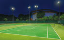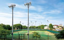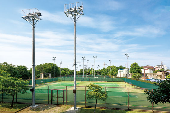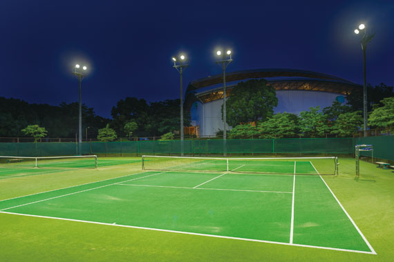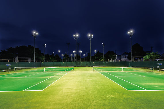 緑豊かな公園内にあるテニスコートを、省エネに配慮したLEDの光で明るく爽やかに照らし出す