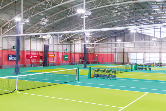 充実した施設を備えたインドアテニススクールのテニスコートを明るく均一な光で照らすインドアテニスコート専用LED照明器具