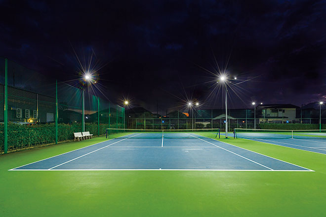 現在、アウトドアコートは、ハードコート(デコターフ)3面、オムニコート(人工芝)2面の計5面を備えており、2017年11月に、ナイター照明が設置されていなかったハードコート3面のナイター照明設置工事を実施しました。これまでも、インドアコート及びアウトドアコートの内オムニコートにLED照明を使用しており、今回のナイター照明設置にあたっては、近隣への光害に十分留意のうえ、テニスコート専用のLED照明器具「レディオック テニスター」を採用したことで、大幅な省エネに貢献しつつグレアを低減し、明るく均斉度に優れた良好な照明環境を作ることが出来ました。当クラブでは、日本はもちろん世界で活躍するテニス選手育成を目標に、ジュニア育成テニススクールも運営しており、日本の大会で多く使用される人工砂入り人工芝コートに加え、国際水準のハードコートを用意していますが、今回、そのハードコートにナイター照明を完備することで、より充実したトレーニング環境を提供することが出来るようになりました。