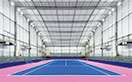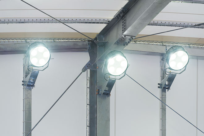 当ドームは敷地面積2743.87m²、延べ面積1609.08m²の鉄骨造(膜構造)で収容人数1,020人という規模を持ち、テニス以外にもさまざまなイベントやスポーツでの利用を想定しています。鮮やかなブルーのコートを照らす照明には、高出力形LED投光器「レディオック フラッド デュエル」が採用され、大会基準である「コート内外指定15ポイント平均Foot Candles(1076ℓx以上)」をクリアしつつ、サイド照明手法により、プレーヤーへのグレアを抑えつつ、左右対称の均斉度の取れた照度分布を実現しています。