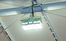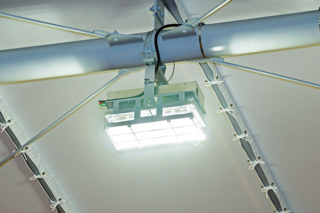 広々とした屋内空間を快適に照らす照明器具については、角形のLED高天井照明器具「レディオック ハイベイ ガンマ」をトータルで42台設置し、JIS照明基準(運動競技区分Ⅲ・屋内)に於けるフットサル・テニスコートの基準照度200ℓx以上をクリアする設計照度375ℓxを確保しています。また、まぶしさを軽減する拡散パネル付き前面ガードを装備することでグレア対策にも十分配慮し、明るくかつ均斉度の取れた照明環境とすることができました。