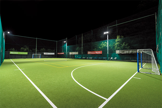 同施設では、9面のうちナイター照明設備のある4面について、省エネ及び省メンテナンスなどの観点からLED化する照明改修を行い、既設メタルハライドランプ1000Wに替えて小形・軽量化を実現した新型の屋外テニスコート用照明器具「レディオック テニスター 400クラス」を設置しました。同じ敷地内にはフットボールクラブ「東急SレイエスFC」が活動拠点として運用しているアディダスフットサルパークあざみ野があります。天然芝でのプレーにより近い感覚でフットサルができるロングパイル人工芝とショートパイル人工芝のアウトドアフットサルコート各1面(39m×19m)を有し、男女更衣室、シャワー室、ロッカールームなどを完備しています。コートレンタルはもちろん、どなたでも参加できる「個人フットサル」なども開催し、多くの方々に親しまれているフットサルコートです。今回のナイター照明LED化では、屋外テニスコート同様「レディオック テニスター」に更新し、既設と同等以上の明るさを確保しつつ、大幅な省エネを実現しました。