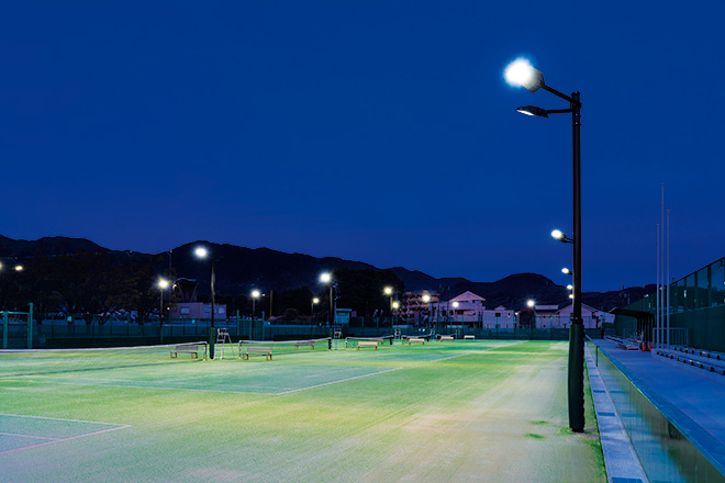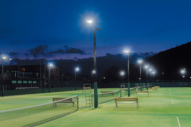 リニューアルオープンしたテニスコートを安全・快適に照らす新型「レディオック テニスター」
