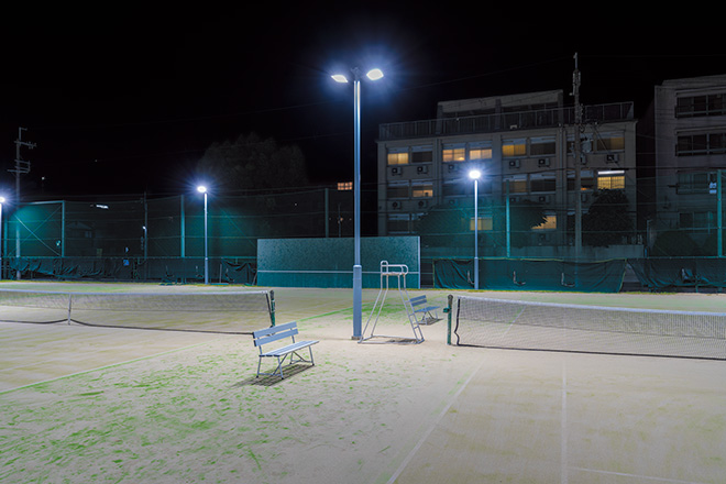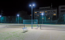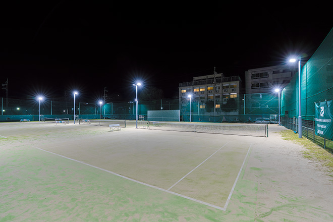 兵庫医科大学では、2023年8月、西宮キャンパスにある全天候型テニスコート3面の照明設備について、既設HID照明をLED化する改修工事を実施しました。同テニスコートは、硬式・軟式テニス部が曜日を分けて毎日使用しているほか、OB・OGの方々も使用しています。LED化にあたっては、テニスコート全体をむらなく照らす均斉度の高い配光設計とするとともに、ボールが見やすいようグレアの軽減に十分留意のうえ、LED投光器「レディオック フラッド レスク 300Wタイプ」に更新しました。メタルハライドランプ1000W相当の明るさを確保し、光束維持時間50000時間の長寿命で省エネ・省メンテナンスに貢献しつつ、明るく快適なナイター照明環境を創出しています。