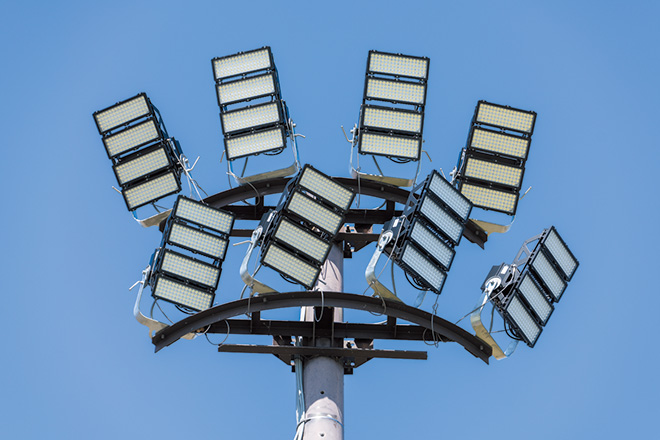 公園内のテニスコートは砂入り人工芝コートが16面あり、そのうち8面に夜間照明を備えています。栃木市では、CO₂削減、省エネ推進、省メンテナンスなどの観点から、2024年3月にテニスコートの夜間照明設備の改修工事を行い、ナイター照明のLED化を実施しました。既設照明器具(メタルハライドランプ1000W)に替えてご採用いただいたLED投光器「レディオック フラッド アヴァン 700クラス」は、メタルハライドランプ1500W相当の明るさを持ち、省エネを実現するとともに明るさも向上させています。