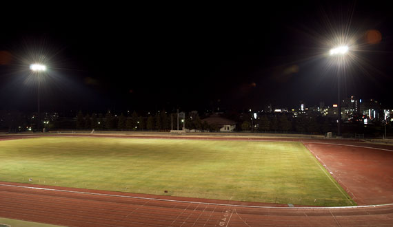 - 国際競技もできる全天候型トラック2種公認競技場であることから、その基準を確保したままの設備となるよう照明塔の配置位置には十分配慮しました。特に既設の施設への設備工事であったため、グラウンドレベルの勾配などにも留意し、綿密な計算及び照度計算のもと、最下段33mの照明鉄塔を全4基設置しました。光源については演色性・効率を考慮のうえ、メタルハライドランプ1kWではなく1.5kWを選択、1基あたり18灯用としました。投光器も従来型投光器に比べ、器具効率が約16%向上した増反射膜仕様を採用し、初期設備費・維持費を軽減・省エネを重視した施設となっています。また、安定器を照明塔下部に置き、地震などに対する安全性を高めました。