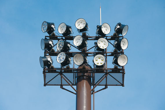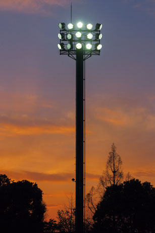 久留米市の文化ゾーン「中央公園」にある久留米総合スポーツセンターは、陸上競技場、体育館、テニスコート、武道館、弓道場や野球場など、充実した施設が揃い、市民のスポーツ・レクリエーションの場として広く親しまれています。久留米市では、2014年春、陸上競技場に隣接する補助競技場の照明設備改修工事を実施し、鉄塔の塗装塗替えと光源のLED化を行いました。既設の照明鉄塔にはメタルハライドランプ1000Wを使用していましたが、高出力形LED投光器(レディオック フラッド デュエル1000Wタイプ)に更新。1基15灯×4基(計60灯)にて200ℓxの設計照度とし、省エネを実現しつつ、明るさの向上を図りました。改修後は「とても明るくなった」と、利用者の皆さまからも好評をいただき、これからの季節、快適なナイター照明のもとで、より多くの方々にご利用いただけることと思います。