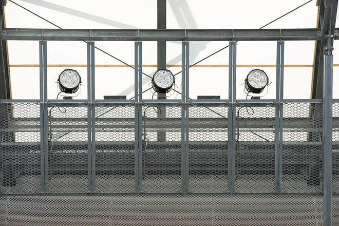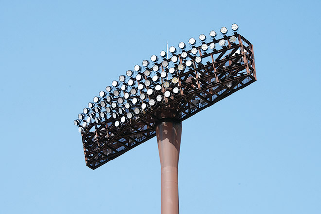 既設の照明鉄塔4塔に設置されていたショートアークメタルハライドランプ2kW投光器278台、メタルハライドランプ1.5kW投光器144台、保安灯24台に替えて、高出力形LED投光器「レディオック フラッド デュエル 1300Wタイプ」×278台、「レディオック フラッド ブリッツ 380Wタイプ」×18台に更新するとともに、新たに屋根部に高出力形LED投光器「レディオック フラッド デュエル 1300Wタイプ」×29台、高出力形LED投光器「レディオック フラッド デュエル 830Wタイプ」×13台を追加設置し、大幅な省エネを実現するとともに、グラウンド面最低1500ℓxを確保することが出来ました。